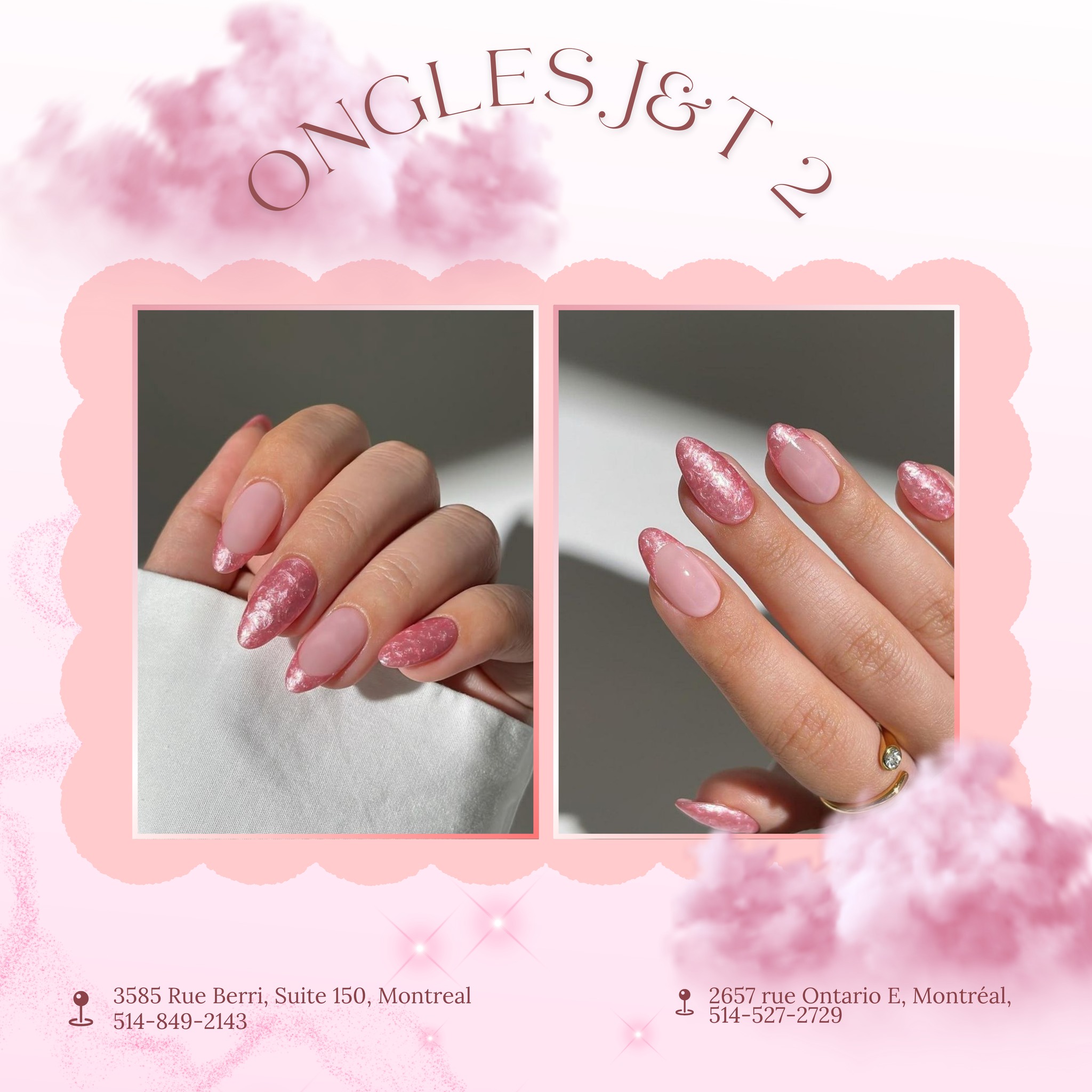 Situés près du centre-ville, nos salons au 2657 Rue Ontario E et au 3585 Rue Berri, Suite 150, rendent les soins d'ongles de luxe accessibles à tous.